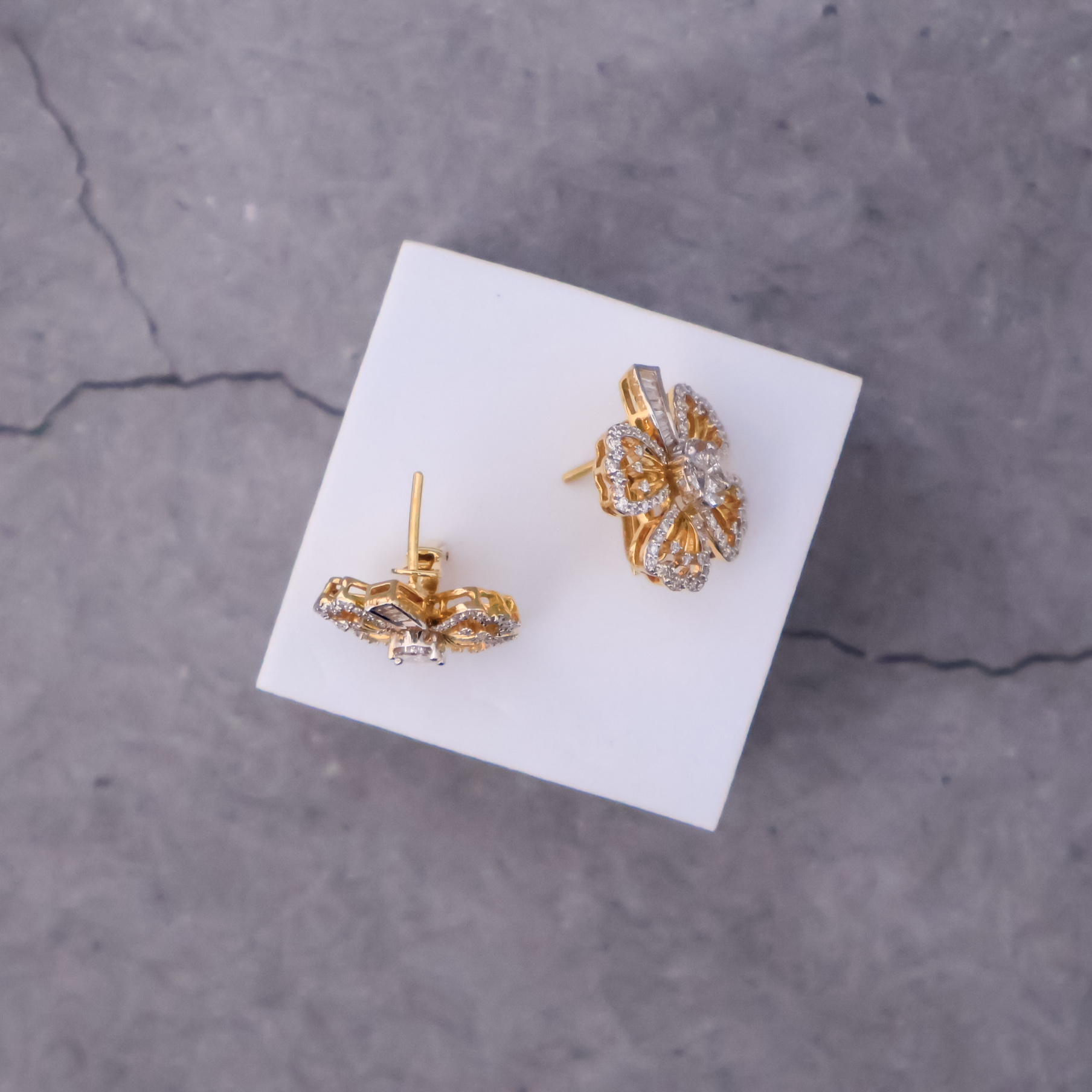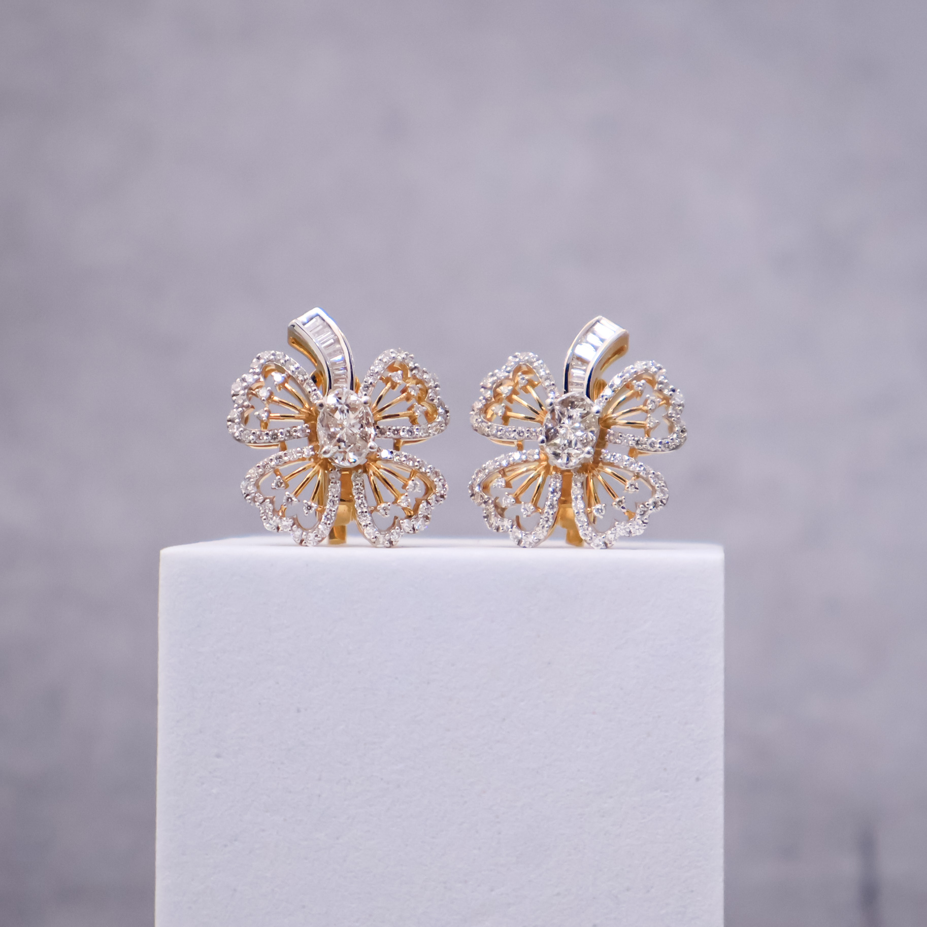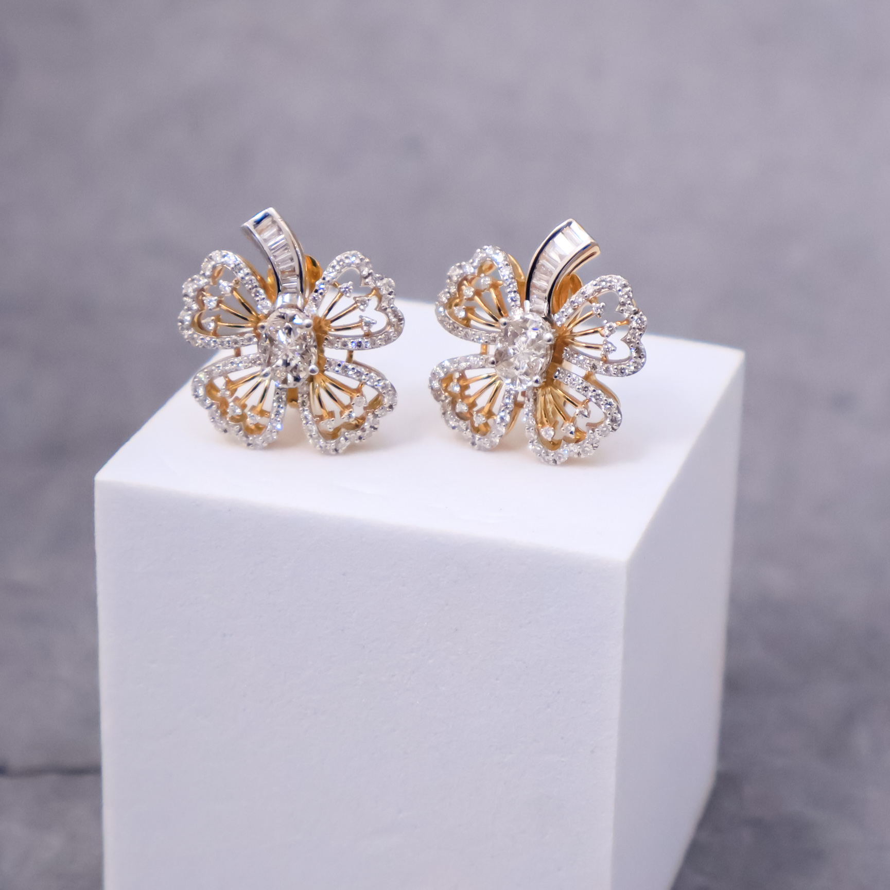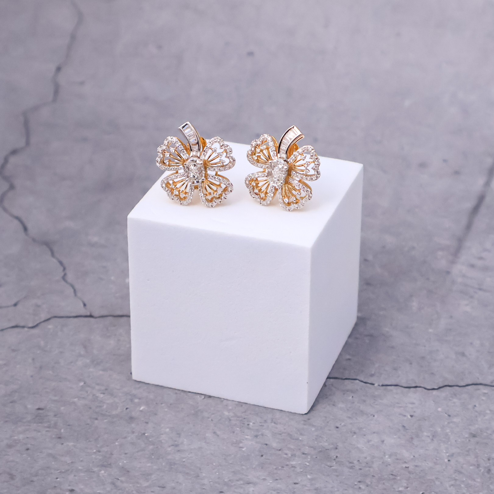 These elegant Radiant Bloom Pie cut Earrings crafted in 14kt yellow gold, features floral design with sparkling diamonds of different shapes, offering a touch of sophistication for any occasion. Timeless, stylish, and now in stock.