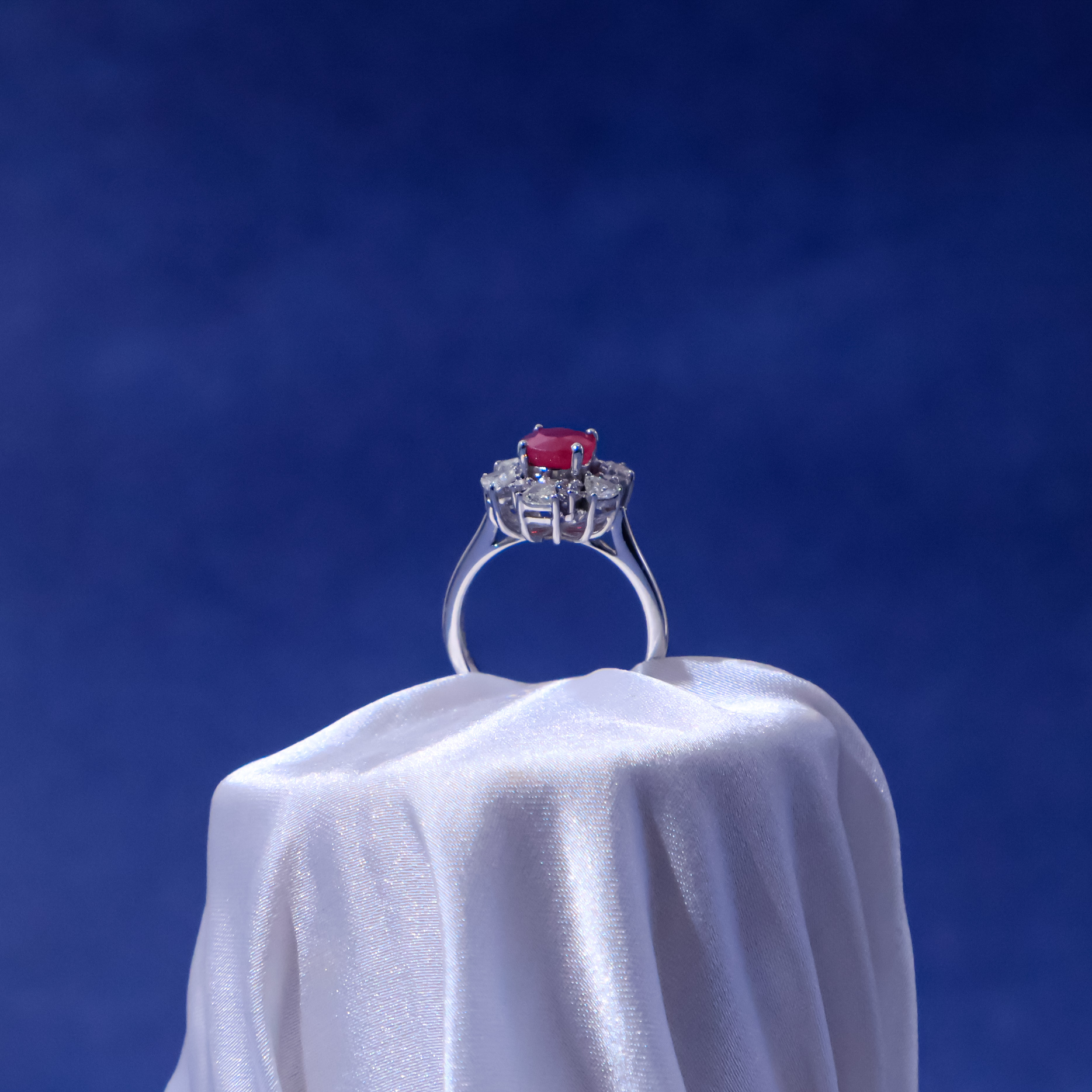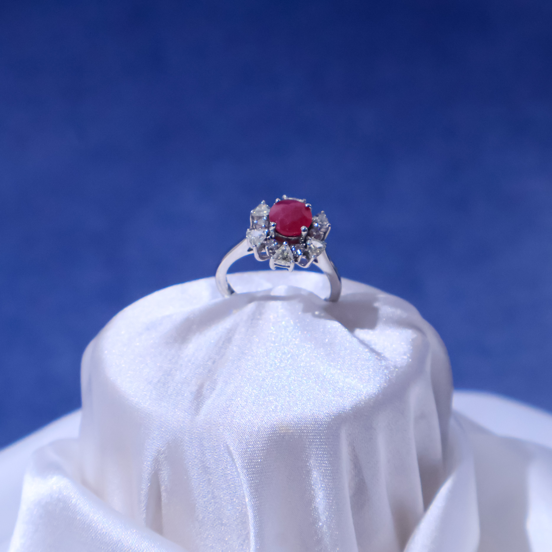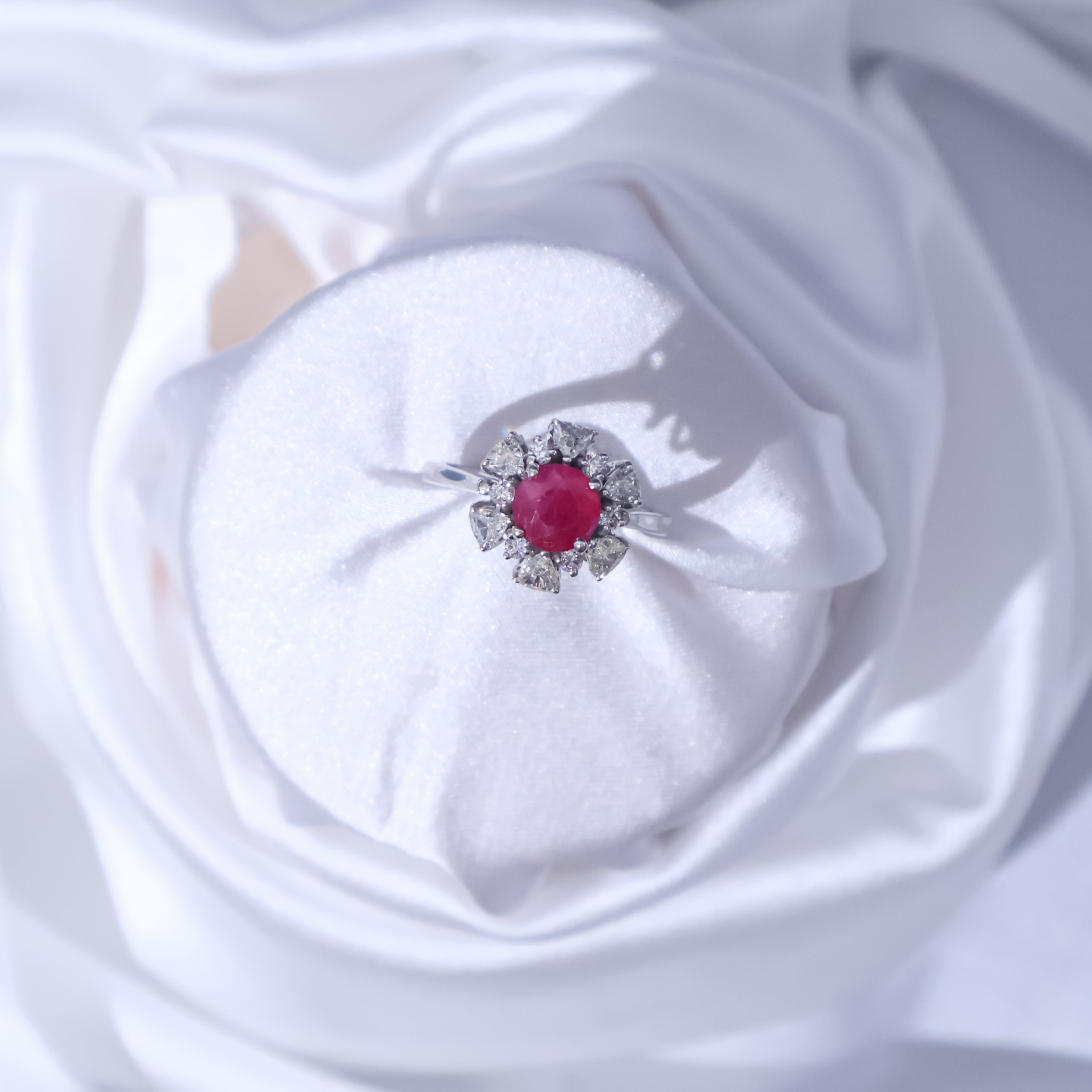 Elegantly crafted in 14kt white gold, this striking ring features a stunning combination of trillion-shaped and round diamonds, gracefully encircled by rich ruby at the center, perfect for those who seek timeless sophistication with a bold touch.