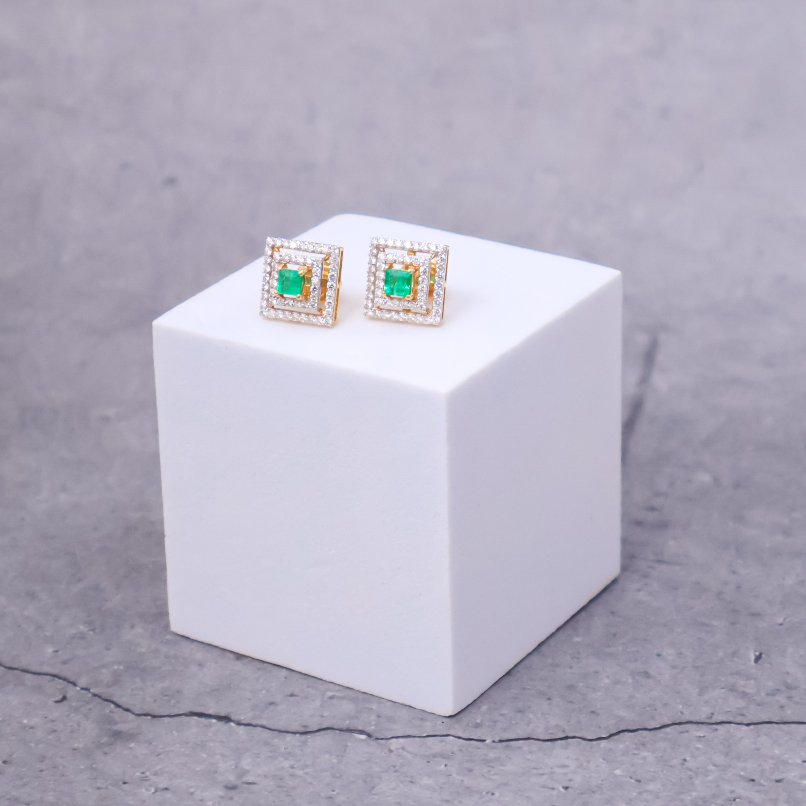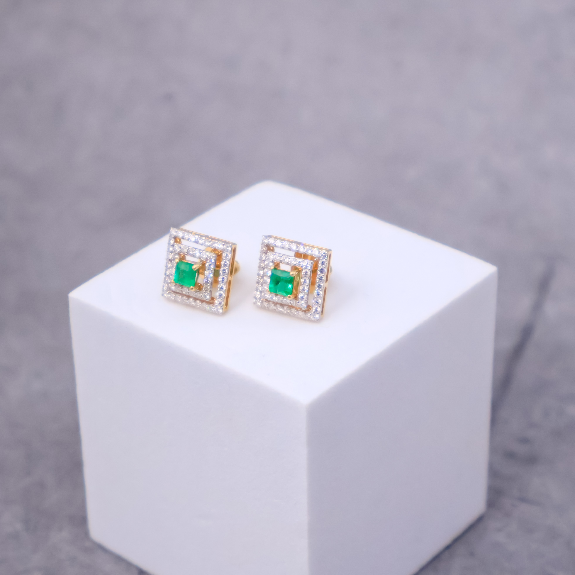 Princess cut Panjshir emeralds from Afghanistan, celebrated for their subtle green hue, are set in 14kt yellow gold, surrounded by sparkling diamonds for a stunning contrast.