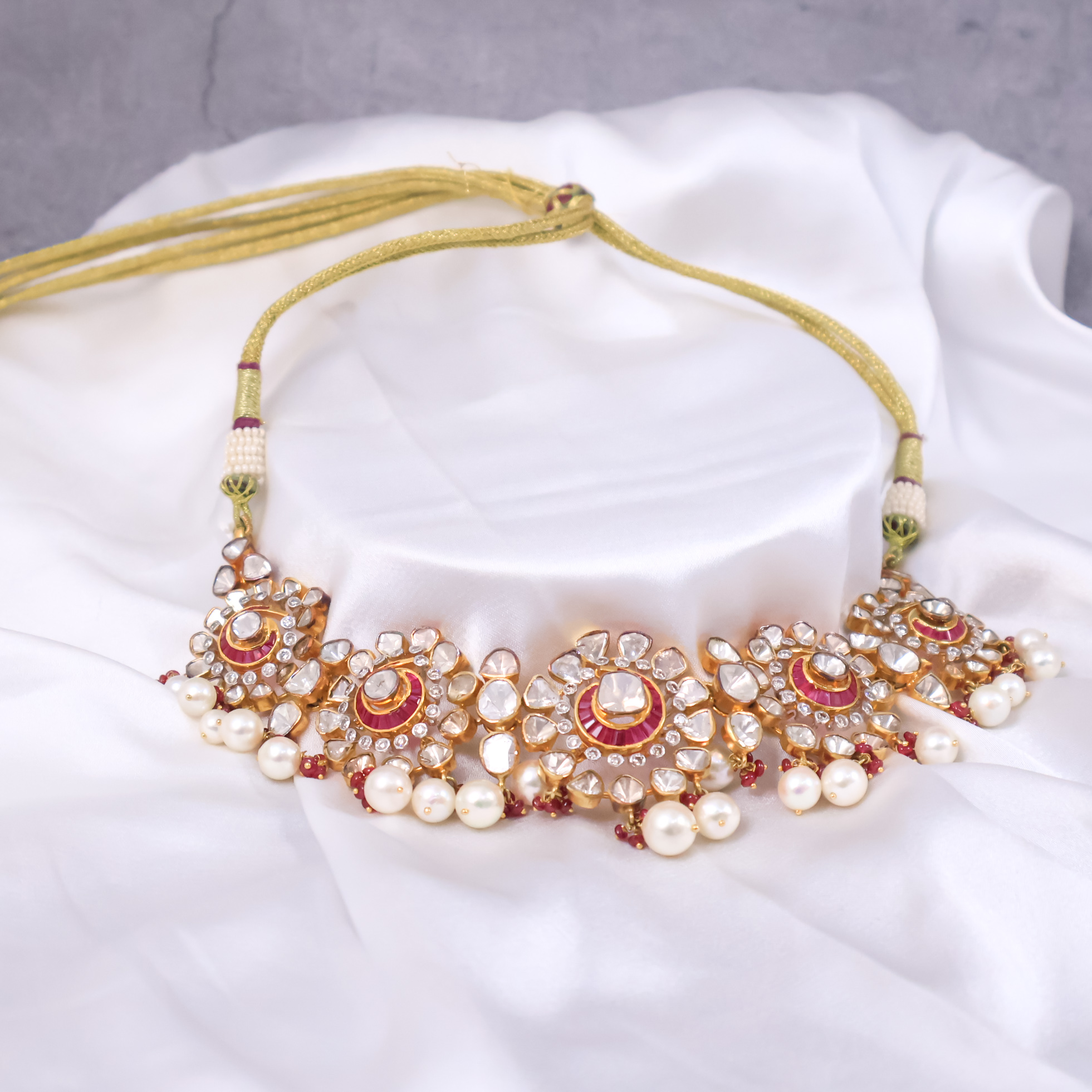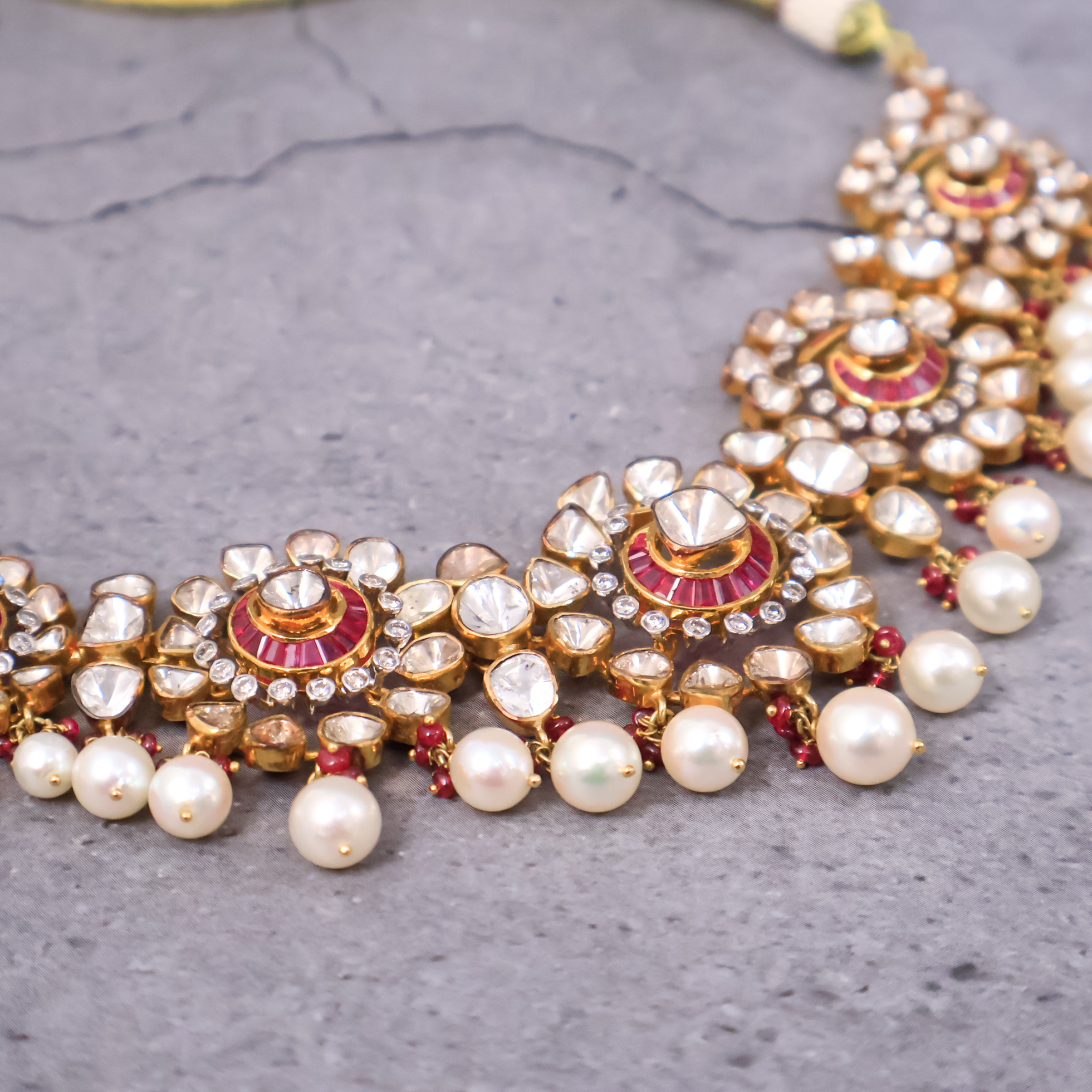 A syndicate polki set in open 18kt yellow gold, showcasing uncut diamonds with baguette shape rubies and freshwater pearls for a radiant, vintage appeal. Perfect blend of traditional elegance and modern style.