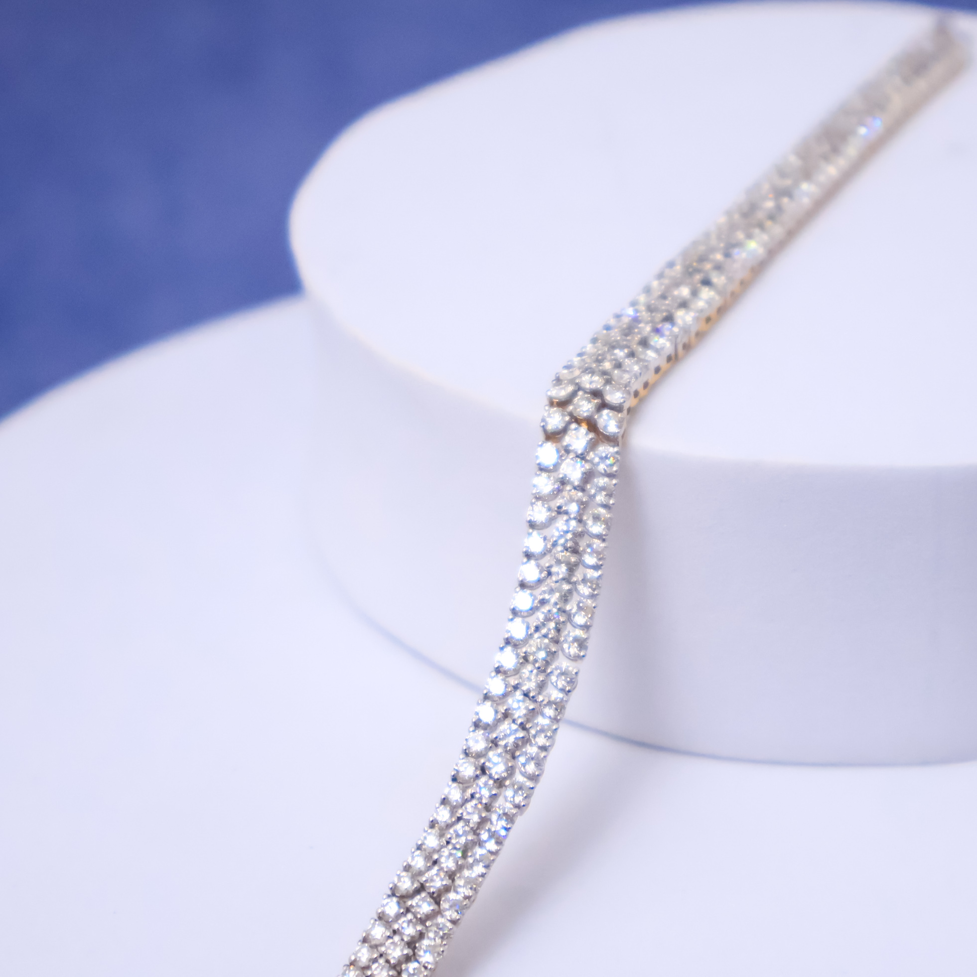 Our handcrafted three-line diamond-studded bracelet, made in 18k yellow gold, is designed for both him and her, offering a stylish and versatile pice of jewellery.