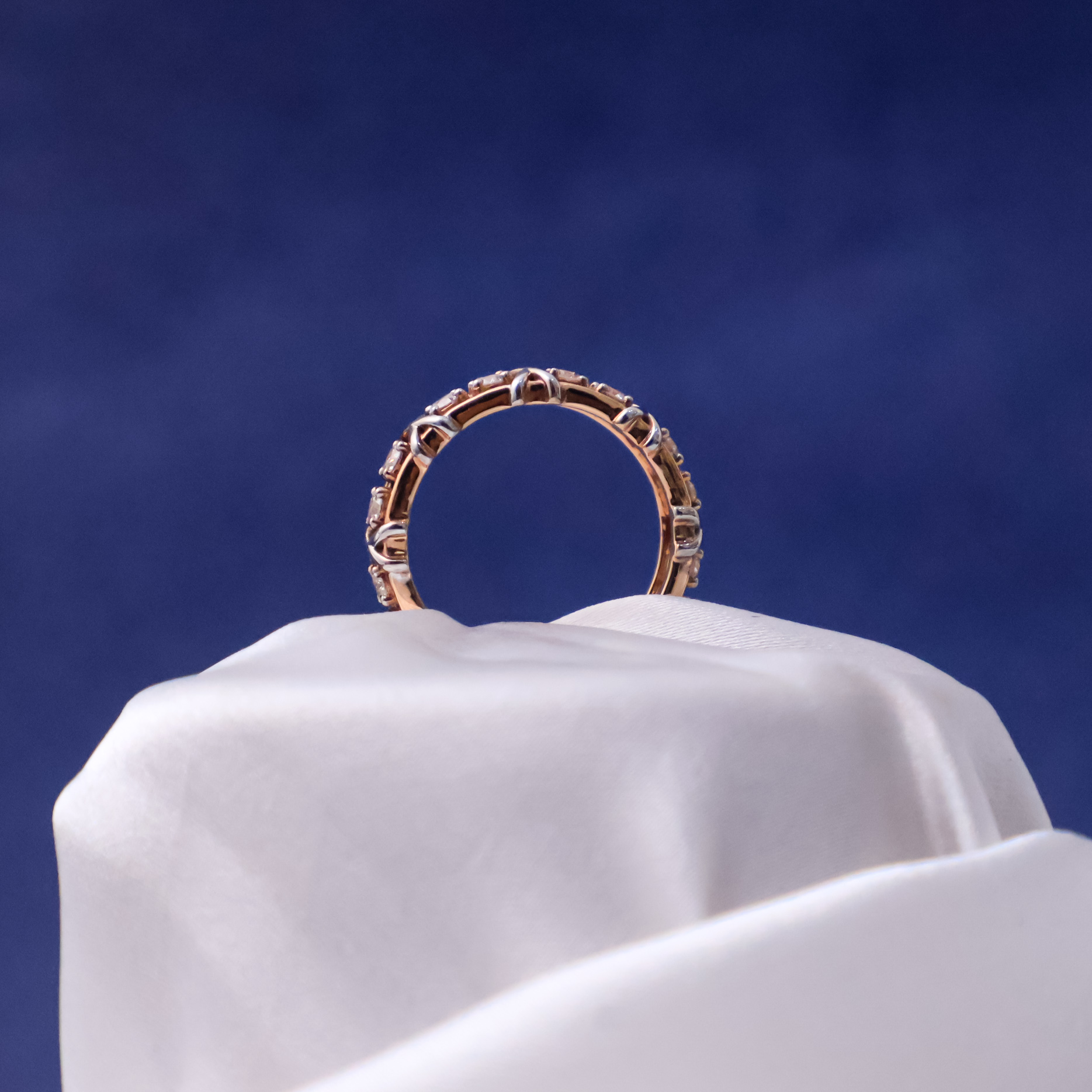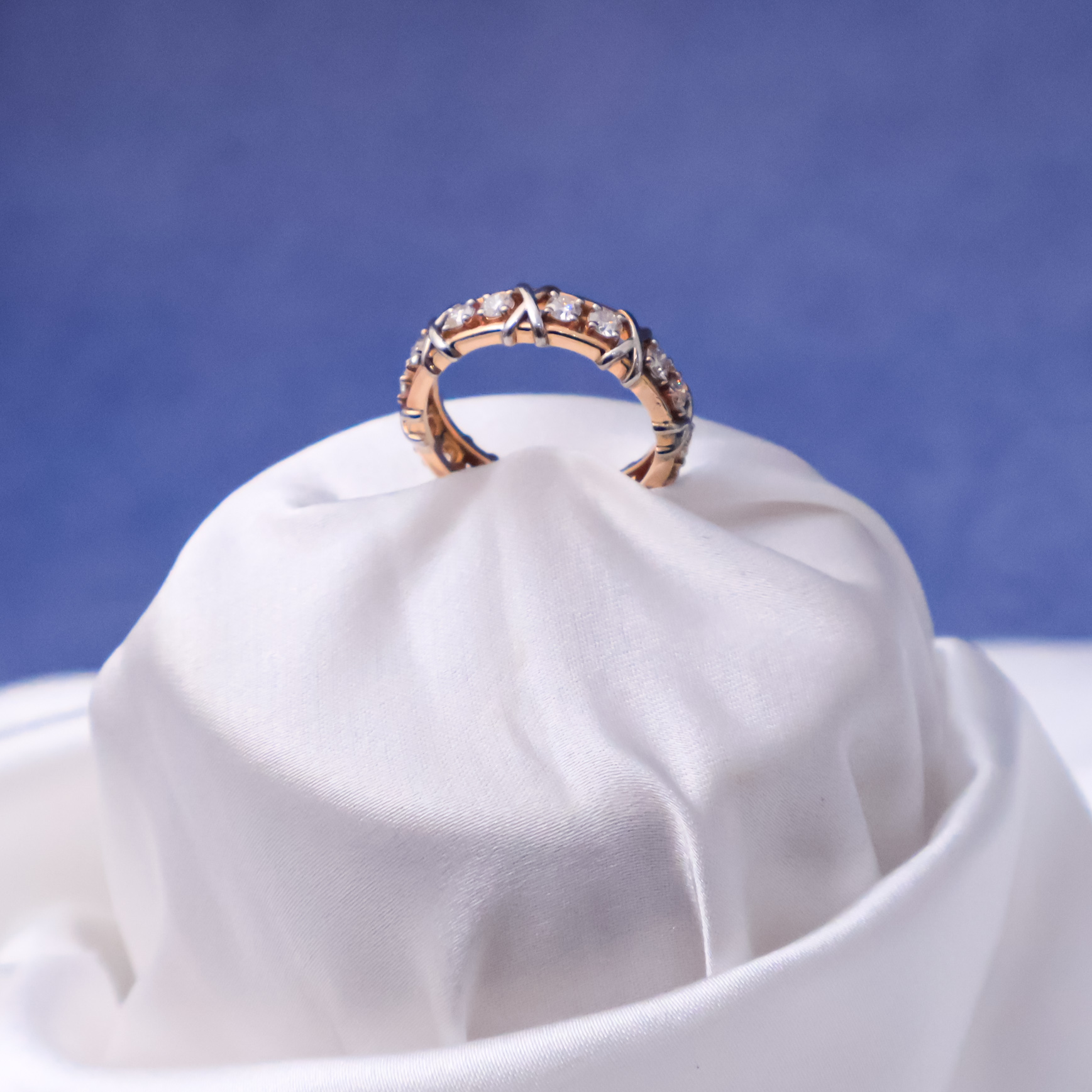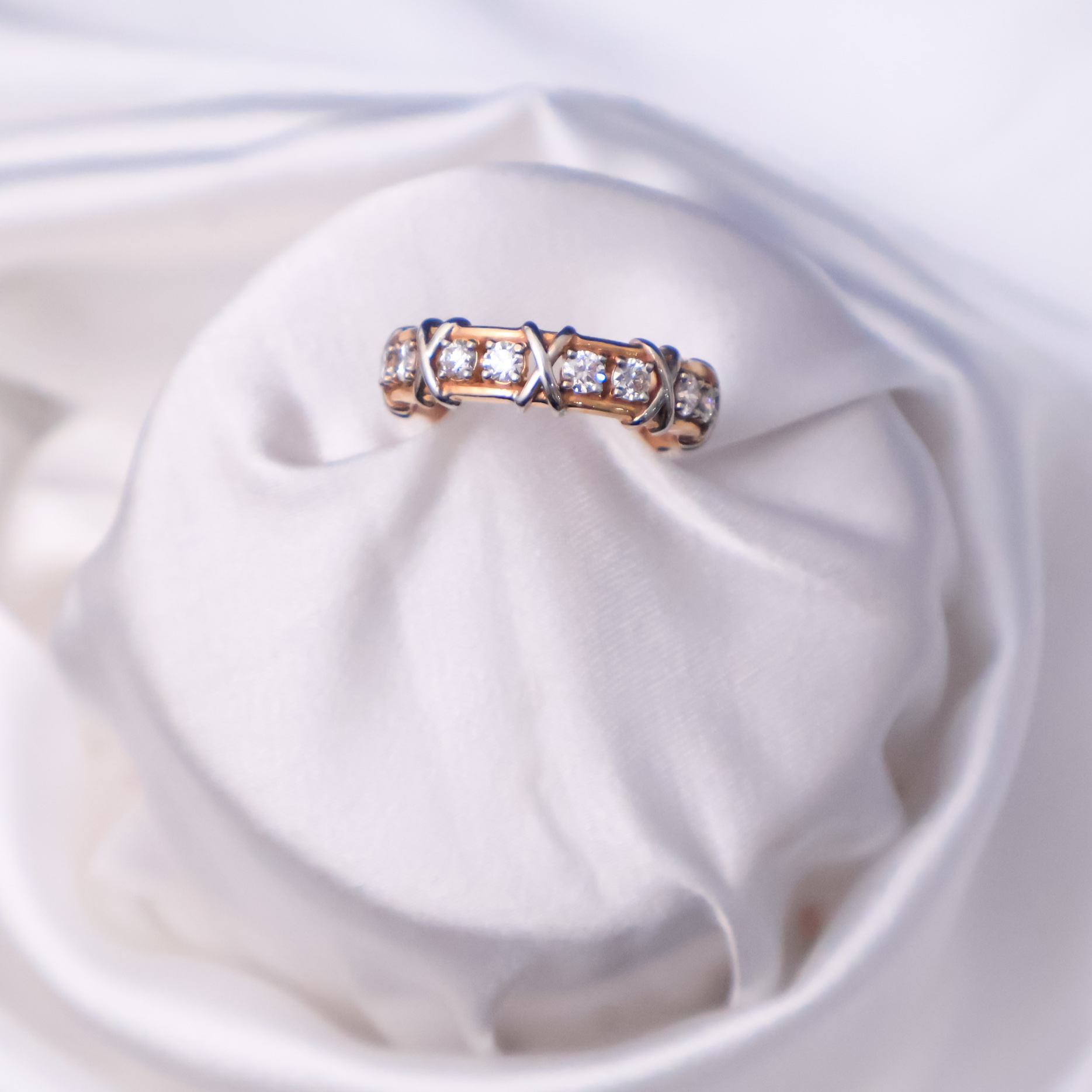 The XOXO band crafted in 14kt white and rose gold, features a contemporary design with diamond accents, blending geometric elements and sparkle for a bold, stylish statement.